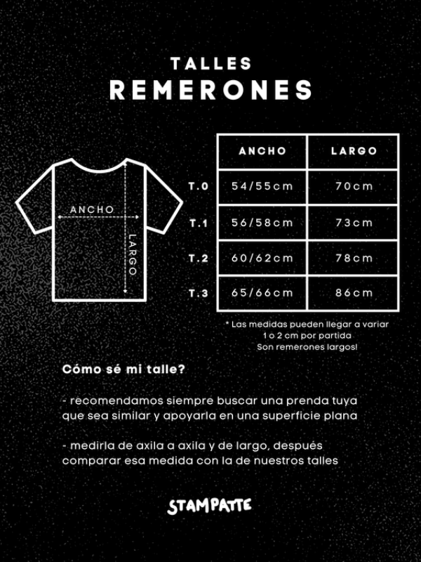 Siempre recomendamos que para estar segurxs del talle, midas un remerón que uses de axila a axila y compares las medidas con las nuestras. Por favor estar segures, como hacemos todo a pedido después no hacemos cambios